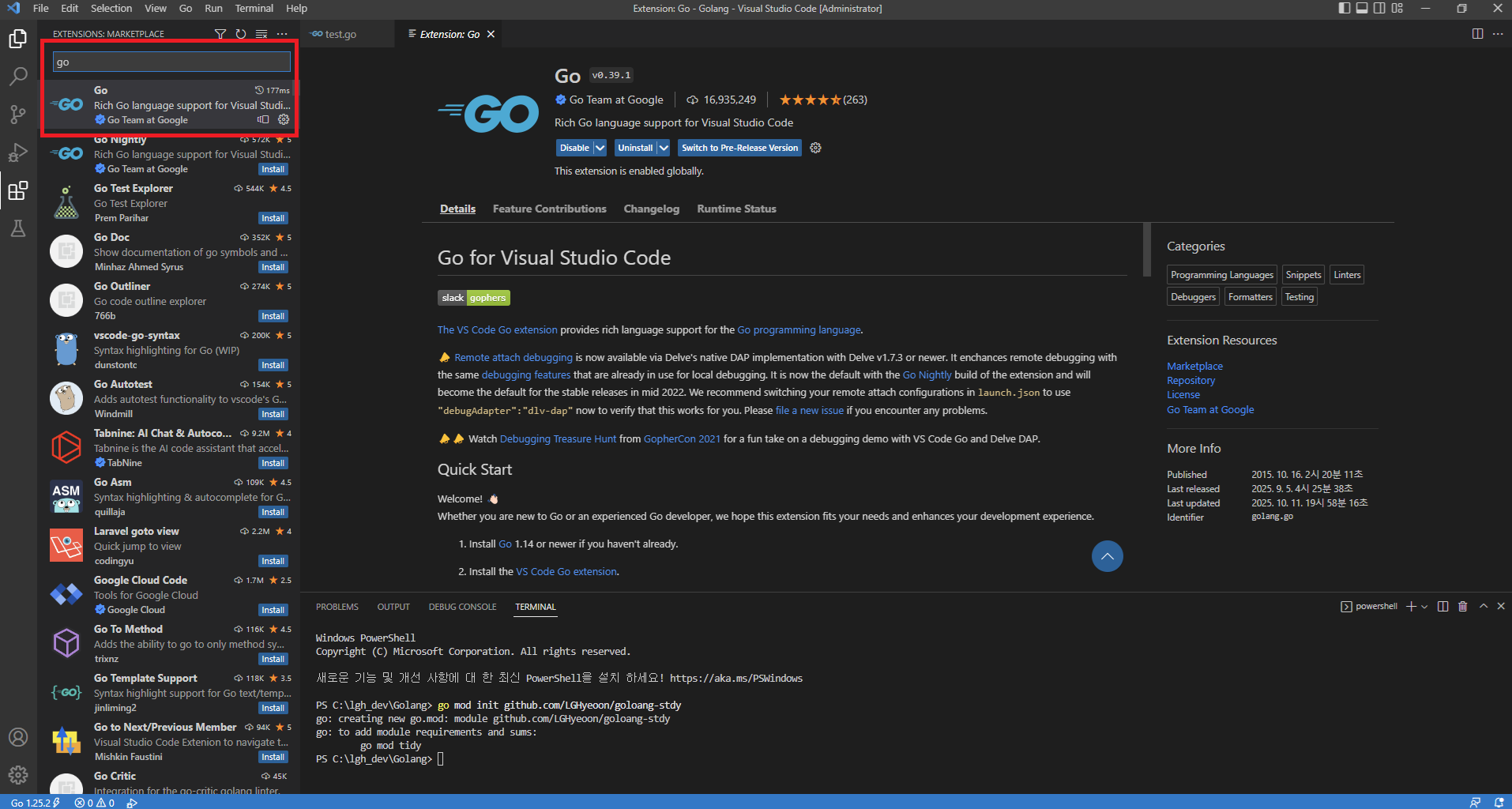 확장의 경우 크게 다운로드받을 것은 없고, "Go" 검색 후 가장 상단에 뜨는 플러그인을 다운로드하면 끝이다.